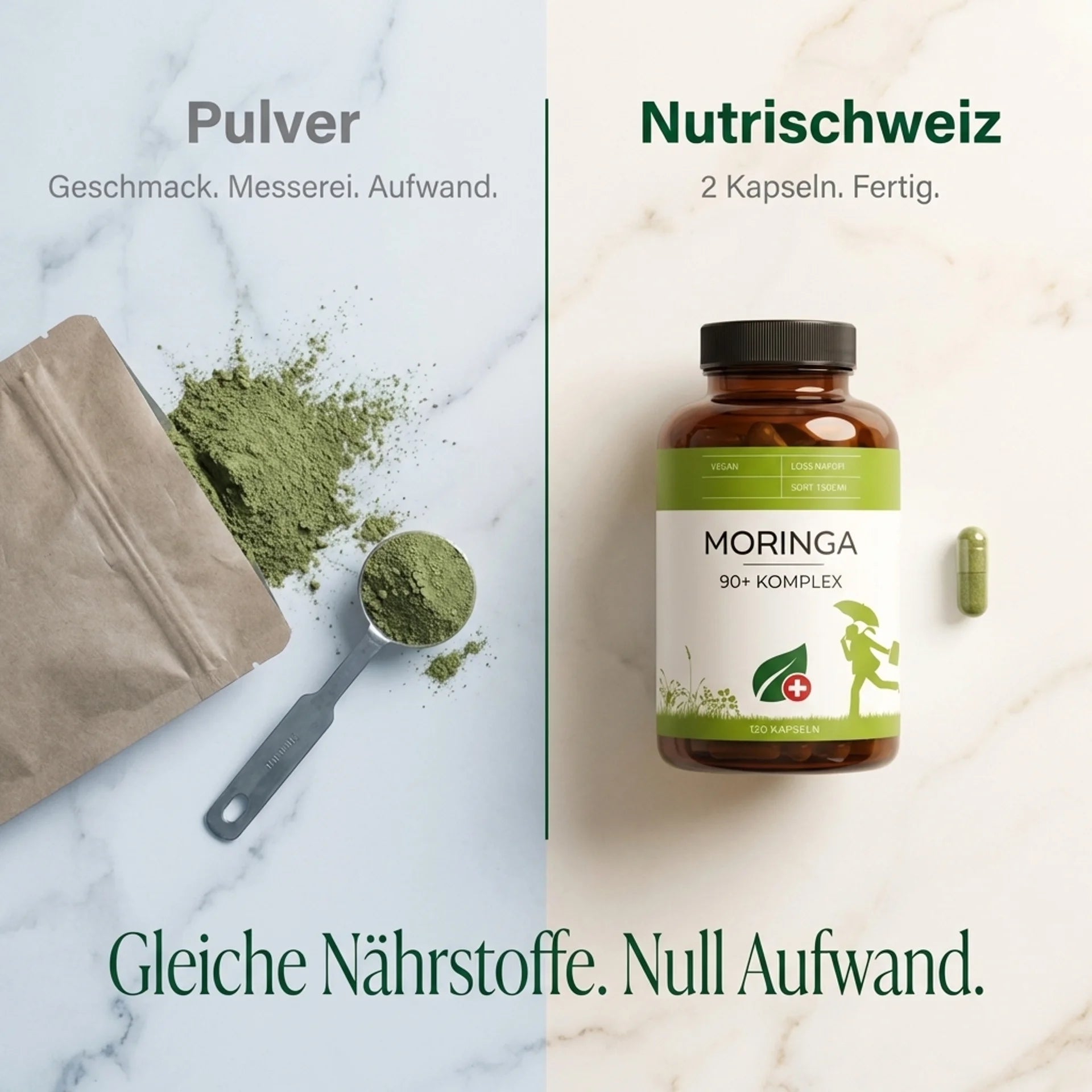 Die meisten Kunden berichten erste Veränderungen nach 7–14 Tagen. Volle Wirkung nach 3–4 Wochen konsistenter Einnahme. Moringa ist kein Stimulans — es baut auf, anstatt zu stimulieren.