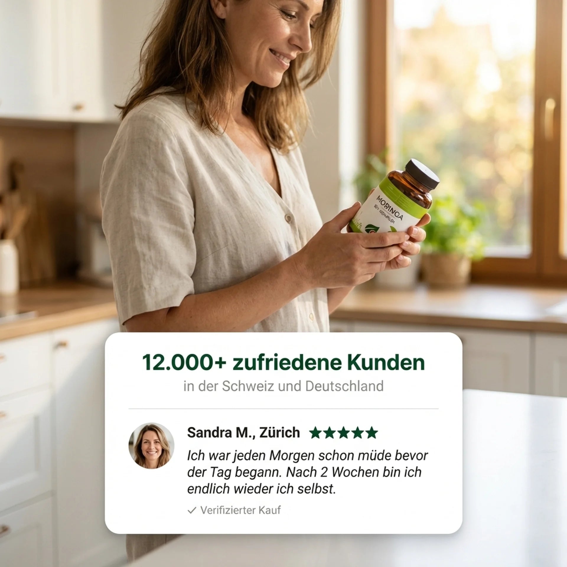 Ja — aber nicht wie Kaffee. Moringa liefert die Nährstoffe die dein Körper braucht um selbst Energie zu produzieren. Eisen, B2 und B6 sind wissenschaftlich anerkannt für ihre Rolle im Energiestoffwechsel. Die meisten Kunden berichten erste Veränderungen nach 7–14 Tagen.